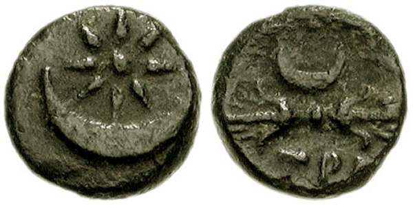 | HN Italy 778 | Graxa, Calabria, AE9, ca 250-225 BC. 0.61 g. Eight-pointed star and crescent / ΓΡA, crescent and thunderbolt. HN Italy 778. | Text | Image |