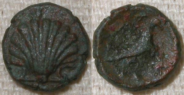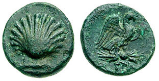 | SNGCop 749 | CALABRIA, Graxa. Circa 250-225 BC. AE 15mm. Scallop shell / ΓΡA below, eagle standing right on thunderbolt.