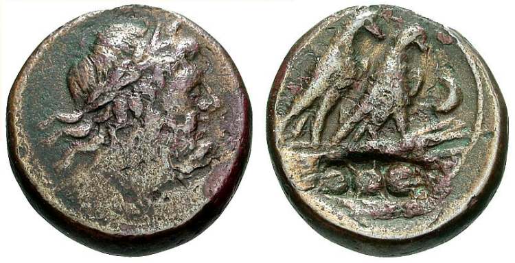 | Sear SG 603 | Graxa, Calabria, AE16. Before 200 BC, Laureate head of Zeus right / GRA, two eagles standing right on thunderbolt, crescent to right. SNG ANS 804; SNG Munich 583; SNG Morcom 251; Sear SG 603. | Text | Image |