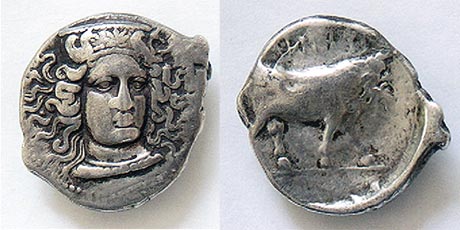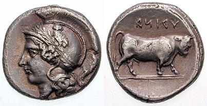 | SNGCop 380 | Hyria, Calabria AR Didrachm or Nomos. 405-400 BC. Head of Hera, three-quarter face to right, in broad stephanos, richly ornamented, and necklace / man-faced bull walking right, retrograde legend ΨPINA above.