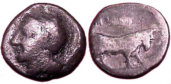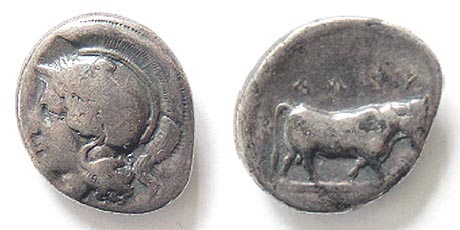 | SNG ANS 251cf | Hyria, Calabria, 405-400 B.C. AR Didrachm. 7.35 grams. Head of Hera, three-quarter face to riight, in broad stephanos, richly ornamented, and necklace. / Man-faced bull walking right. | Text | Image |