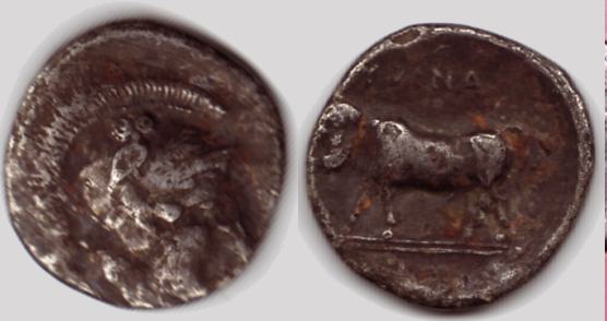 | SNGANS 261 | Hyria, Calabria AR Didrachm. ca 405-385 BC HN-539, SNG ANS-261. Head of Athena left / Man-headed bull standing right. HN 539.
