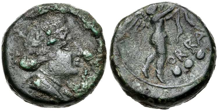 | BMC 6 | Hyria (Orra), Calabria, AE quincunx. 217-89 BC, Bust of Aphrodite right / ORRA, Eros walking right, playing lyre, five dots behind.