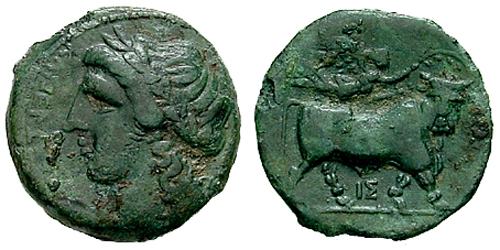| SNGANS 230 | Campania, Compulteria. Circa 265-240 BC. Æ 18mm. Laureate head of Apollo left / Man-headed bull right. Rutter HN 437. | Text | Image |