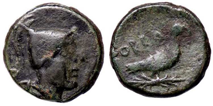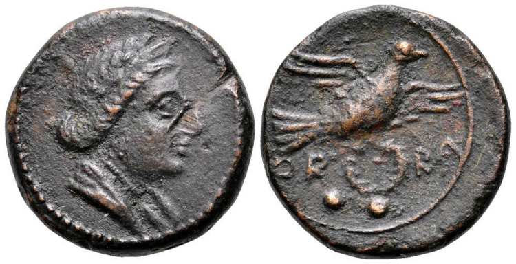 | SNG ANS 824 | Hyria, Calabria. AE15 Biunx (2 uncia), ca 210-150 BC. 3.3 g. Laureate, draped bust of Aphrodite right, wearing stephane, short sceptre against her shoulder. / OR-RA and two dots beneath dove flying right, holding large wreath in its talons. SNG ANS 824; SNG Cop 763; SNG France 6, 1569; Paris 749; SNG Munich 55; HN Italy 795. | Text |  |