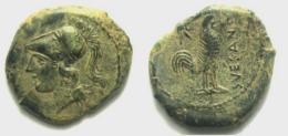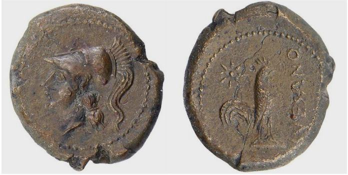 | SNG ANS 609 | Suessa Aurunca, Campania AE Litra. 265-240 BC. 4,26 gr. 19 mm. Helmeted head of Athena left, helmet decorated with serpent / SVESANO, Cock standing right, star at upper left. BMC 16; SNG ANS 609. | Text | Image |