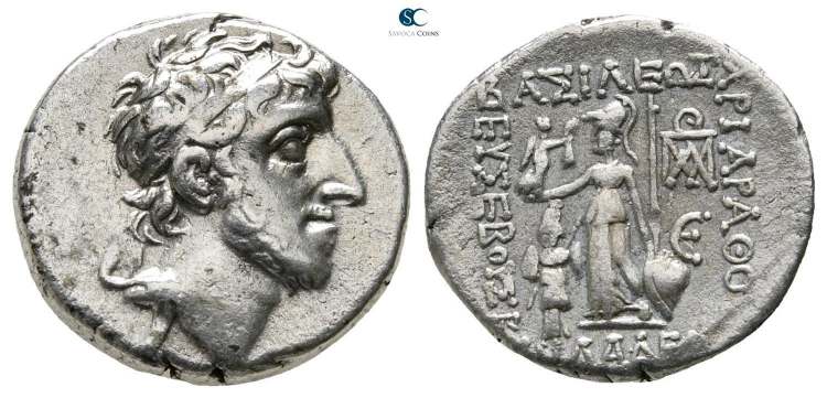 | BMC 2 | Ariarathes X Eusebes Philadelphos, King of Cappadocia. Mint A (Eusebeia under Mt.Argaios). 42-36 BC. AR Drachm 16 mm, 3.92 g. Diademed head right. / BAΣIΛEΩΣ AΡIAΡAΘOY EYΣEBOYΣ KAI [ΦIΛAΔEΛΦOY], Athena standing left, holding Nike and spear, left hand resting on shield, trophy to left, ΘΠMΛ monogram over E at inner right. Simonetta 2; BMC 2; HGC 855. | Text | Image |