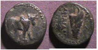 | BMC 4 | Kingdom of Cappadocia, Ariarathes X AE16. 42-36 BC. Bull right, head facing / BAΣIΛEΩΣ AΡIAΡAΘOY, bow in bow case. | Text | Image |
