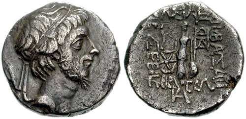 | BMC 5cf | Ariobarzanes III, King of Cappadocia, 52-42 BC, silver drachm of 17.3 mm, 3.97 grams. Diademed bust right / Athena standing left holding small Nike and spear.
