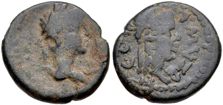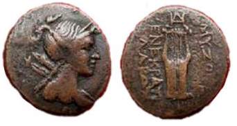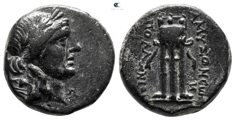 | SNG vA 2416 | Amyzon, Caria. AE16 civic issue. 150-100 BC. Magistrate Apollonios. 4.53 g. Laureate and draped bust of Artemis right, bow and quiver at shoulder. / AMYZONEΩN AΠOΛΛΩNIOC, tripod. SNG von Aulock 2416. | Text | Image |