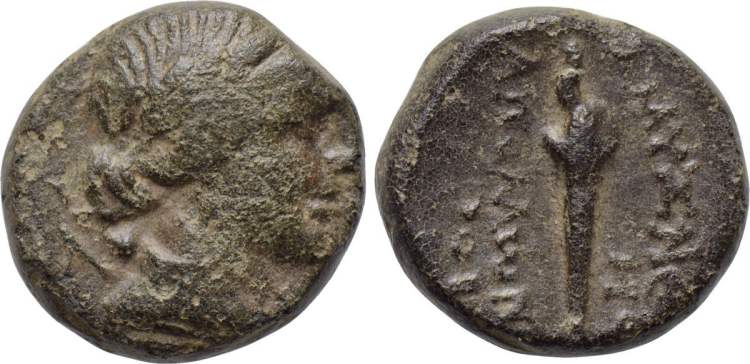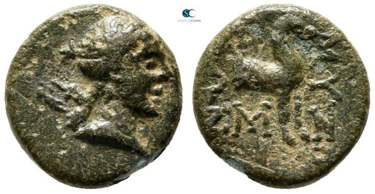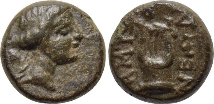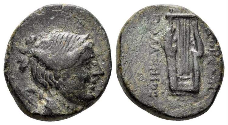 | Vossen 17364 | Amyzon, Caria. AE19, civic issue, ca. 200-100 BC. 5.28 g. Magistrate Apollonios. Head of Artemis right, bow and quiver behind shoulder. / AMYZONEΩN AΠOΛΛΩNIOΣ to right and left of lyre. Unpublished magistrate for this reverse. Vossen 17364. | Text | Image |