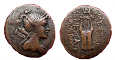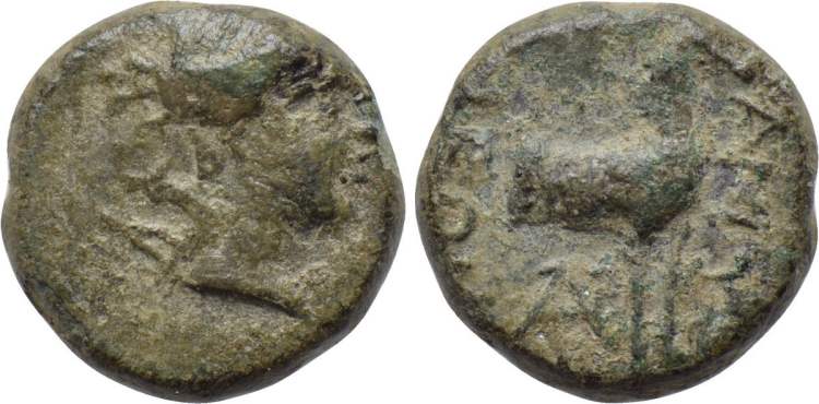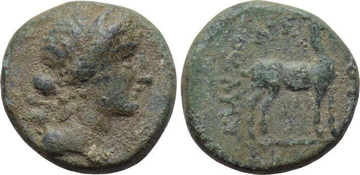 | SNG vA 8054 | Amyzon, Caria, AE16, civic issue, 200-100 BC. Draped bust of Artemis right, hair in a bun, bow and quiver at shoulder / AMYZONEΩN (ΔHMHTΡIOΣ) to left and right of stag standing right. SNG von Aulock 8054; Waddington 2138; Imhoof KM 1. | Text | Image |
