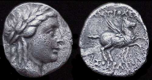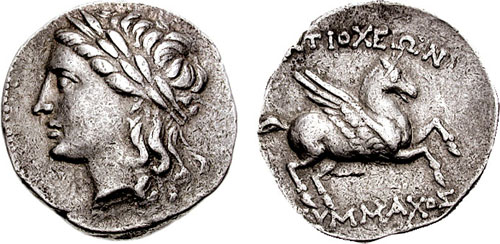 | Boehringer 16 | Alabanda, Caria (as Antioch) AR Tetradrachm. Circa 197-190/188 BC. Struck under Antiochos III of Syria; Symmacheos, magistrate. Laureate head of Apollo left / ANTIOXEΩN ΣYMMAXOΣ, Pegasos flying right. SNGvA 2380. | Text | Image |