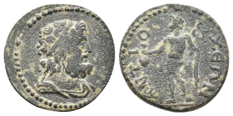 | SNG Cop 44 | Antioch ad Maenandrum, Caria AE 18mm. Semi-autonomous issue. AD 200-250. ΔHMOC, Diademed head of Demos right, slight drapery on left shoulder / ANTIOXEΩN, Dionysos, naked, standing left, holding kantharos and thyrsos. SNG Cop 44; Bernhart 92; Waddington 2180; Kurth Demos 707. | Text | Image |