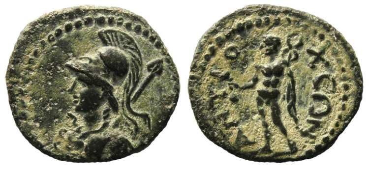 | RPC 2834 | Augustus AE13 of Antioch, Caria. CEBACTOC, bare head right / ΠAIΩNIOY CYNAΡCIA ANTIOXEΩN, Athena standing left, holding spear and shield. RPC 2834; BMC 28; SNG Munich 76. | Text | Image |