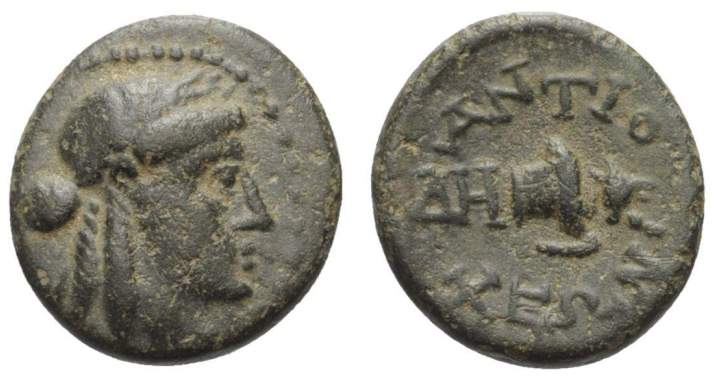 | RPC 2835 | Tiberius, AE of Antioch ad Maeandrum, Caria. 2.92 g. TIBEΡIOC, bare head right / ANTIOXEΩN (retrograde), turreted head of Tyche right. RPC 2835; SNG Cop. 47. | Text | Image |