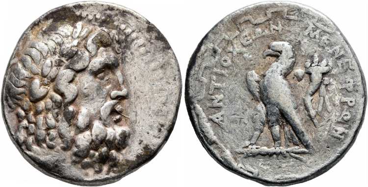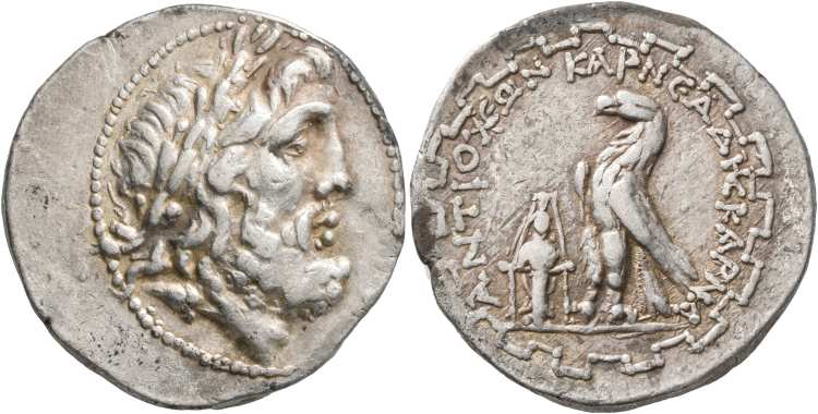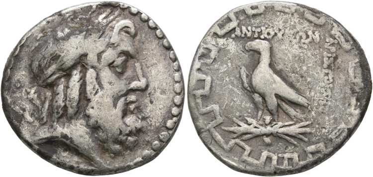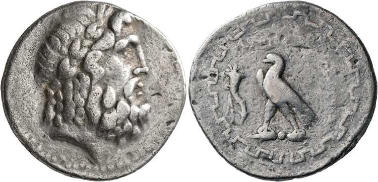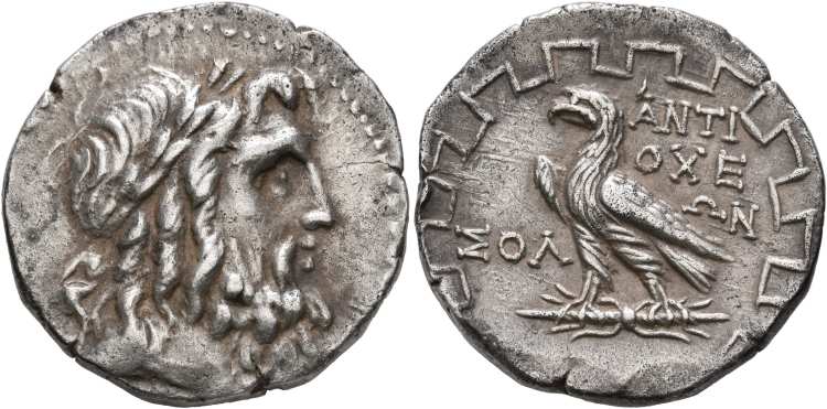 | Thonemann 8 | Antioch ad Maeandrum, Caria, AR tetradrachm, ca. 90-60 BC. 27 mm, 15.63 g. Magistrate Solon. Laureate head of Zeus right. / ANTIOXEΩN ΣOΛ, eagle standing left on thunderbolt within maeander pattern. Thonemann 8a-8b; HN Caria 1530; Paris 98. | Text | Image |