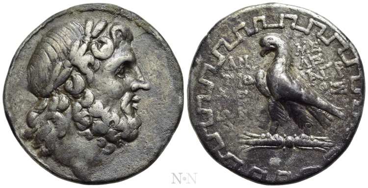 | wwxls AR13174 | Antioch ad Maeandrum, Caria, AR tetradrachm, ca. 90-60 BC. 27 mm, 16.14 g. Magistrate Apollodoros. Laureate head of Zeus right. / ANTIOXEΩN AΠOΛΛOΔΩΡOΣ, eagle standing left on thunderbolt within maeander pattern. Unpublished magistrate. wwxls AR13174; Leu 30, 775. | Text | Image |