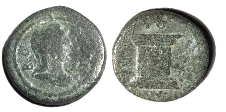 | BMC 22 | Antioch ad Maeandrum, Caria, AE26, AD 238-268. 6.33 g. IEΡA BOYΛH, draped and veiled bust of Boule right. / ANTIOXEΩN, Tyche standing left, holding rudder and cornucopiae. BMC 22. | Text | Image |