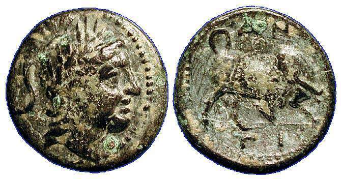 | SNG Tübingen 3335 | Alabanda, Caria, as Antioch, AE13, civic issue, 197-189 BC. 1.52 g. Laureate head of Apollo left. / ANTI-OXEΩN above and beneath Pegasos leaping right. SNG Tuebingen 3335. | Text | Image |