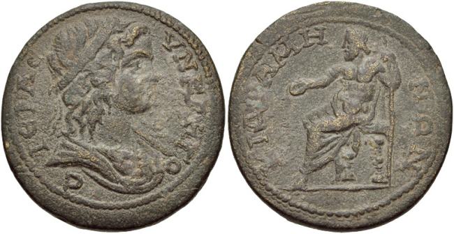 | BMC 1 | Cidramus, Caria. Pseudo-autonomous issue. 3rd century AD. AE 34mm 26.27 g. IEΡA CVNKΛHTOC, Diademed and draped bust of youthful Senate right / KIΔΡAMHNΩN, Zeus seated left, holding patera and sceptre. SNG München 273; BMC 1. | Text | Image |