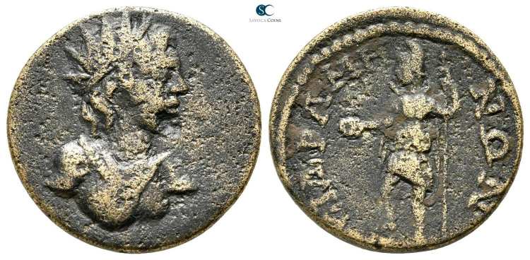 | RPC II 1260 | Cidramus, Caria. AE18, semi-autonomous issue. AD 69-79. 3.5 g. KIΔΡAMHNΩN, radiate, draped bust of Helios right. / ΠAMΦIΛOC CEΛEYKOY (anticlockwise from below), Hermes standing left, holding purse and caduceus. Imhoof GRM 1; Vienna GR31407; Imhoof KM 25; RPC II 1260. | Text | Image |
