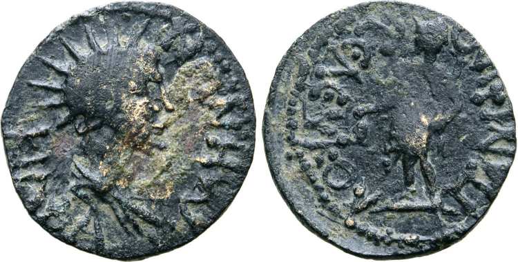 | BMC 10 var | Cidramus, Caria, AE20, semi-autonomous issue. ca AD 218-222. Radiate and draped bust of Helios right. / KIΔΡAMHNΩN, Mên standing left, crescent on shoulders, right foot on bucranium, holding pine-cone and sceptre. BMC 10 var (this reverse for Julia Maesa); Waddington 4941 var (ditto); SNG von Aulock 2591 var (ditto). Savoca 28, 199. | Text | Image |