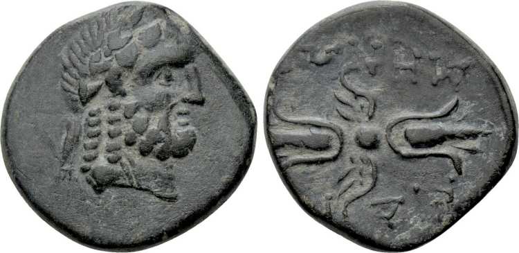 | SNGvA 2583 | Cidramus, Caria. AE17 civic issue. ca 200-10 BC. 4.3 g. Laureate head of Zeus right. / KIΔΡAMHNΩN, winged thunderbolt. SNG von Aulock 2583 otherwise unpublished. | Text | Image |