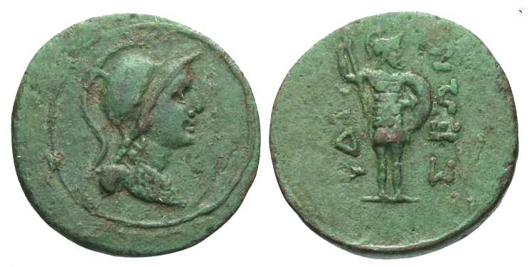 | BMC 1 | Hydisus, Caria. AE19 civic issue, 100-1 BC. 4.33 gr. Helmeted and draped bust of Athena right, wearing aegis / YΔI-ΣEΩN, Ares standing front, looking right, holding spear and shield. BMC 1-2. | Text | Image |