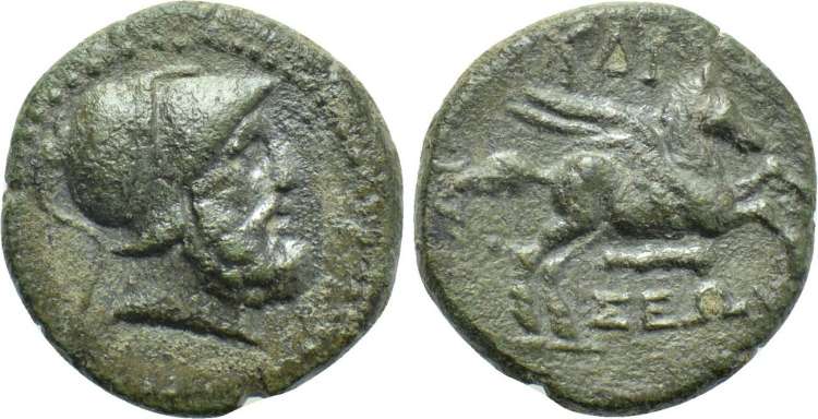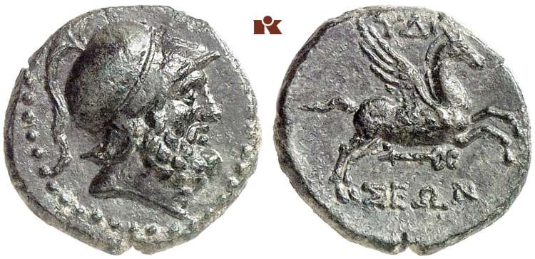 | Naumann 57, 290 | Hydisos, Caria. AE15 civic issue, ca 150-50 BC. 3 g. Helmeted head of Zeus Areios right. / YΔI-ΣEΩN above and beneath Pegasos flying right, club below. Unpublished with club below. Delrieux -; Mionnet -; Imhoof -; BMC -. etc. Naumann 57, 290. | Text | Image |