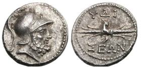 | SNG Hel. 56 | Caria, Hydisus AR Hemidrachm. 1st century BC. Bearded head of Zeus Areios right in crested helmet / YΔI-ΣEΩN above and beneath winged thunderbolt. SNG Helsinki (Keckman) 56; Boston 1965. | Text | Image |