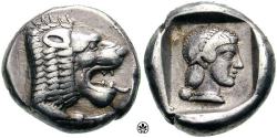 | Cahn 27 | Knidos, Caria AR Drachm. Circa 520-495 BC. Head of a roaring lion right / Archaic head of Aphrodite right, within incuse square. SNG Helsinki 111, SNG Copenhagen 200. | Text | Image |