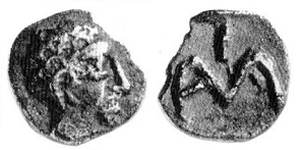 | Konuk 2 | Latmos, Caria, AR tetartemorion, 0.15 gr. 400-350 BC. Older, bearded male head right / ΛATM monogram as T over AΛM. Konuk, Latmos 2. | Text | Image |