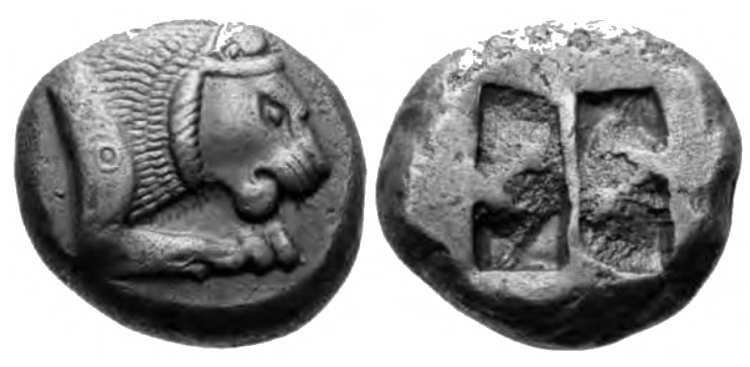 | HNO 1854 | Mylasa, Caria, AR stater, 510-490 BC. 11 g. Head and forelegs of lion right, Θ on collar. / Bipartite incuse with irregular pattern in each section. HNO Caria 1854. | Text | Image |