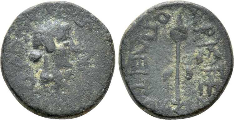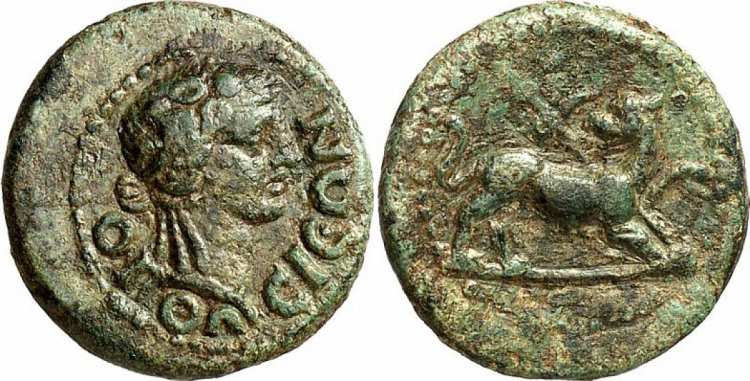 | RPC Supp 2, 2826A | Nero and Agrippina II, AE20 of Orthosia, Caria. AD 54-68. 5.14 g. NEΡΩN CEBACTOC AΓΡIΠΠ, jugate busts right of bare-headed and draped busts of Nero and Agrippina right / OΡΘOΣIΩN, the Dioskuri, standing facing, looking at each other, each holding a bow and with their horses at their sides. RPC S2-I-2826A. | Text | Image |