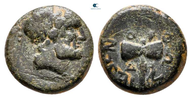 | BMC 2 | Orthosia, Caria. AE15, civic issue, 100-1 BC. 2.31 g. OΡΘΩΣIEΩN, head of Dionysos right, wreathed with ivy. / AΡIΣTEAΣ OΠΛEITOY downwards to right and left of filleted thyrsos. BMC 2-3; SNG Righetti 972; SNG von Aulock AUL 2645. | Text | Image |
