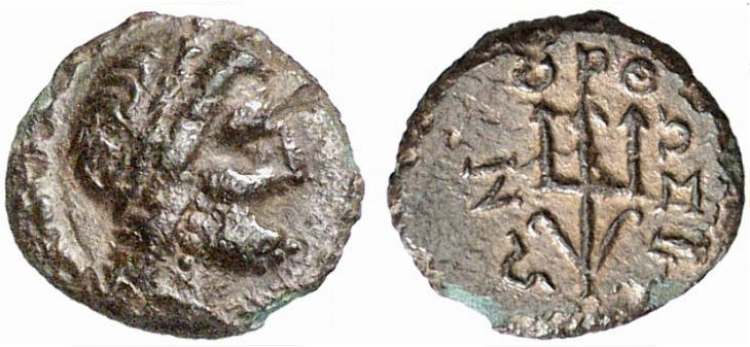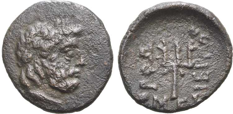 | Imhoof KM 1 | Orthosia, Caria, AE16. 276-30 BC. Laureate head of Poseidon right. / OΡΘΩΣIEΩN ME, trident. Imhoof Kleinas. Muenzen 1. | Text | Image |