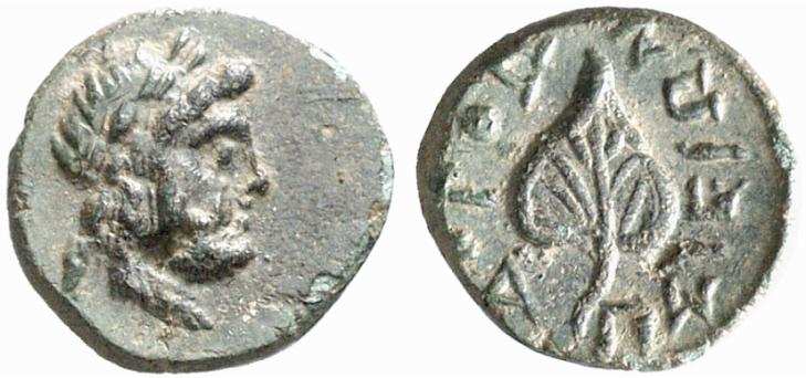 | Imhoof MG 74 | Orthosia, Caria. ca 2nd-1st centuries BC. Laureate head of Zeus right. / OΡΘΩΣIEΩN, ivy leaf. Imhoof MG 74; SNG Cop 454 corr. ("bunch of grapes"). | Text | Image |