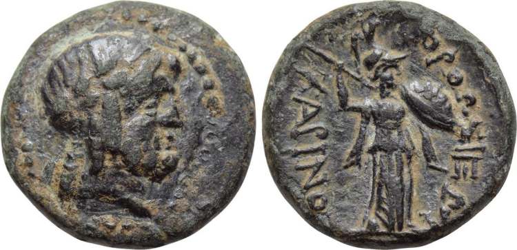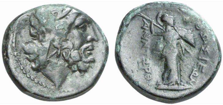 | wwxls BC6700 | Orthosia, Caria, AE17, 2nd century BC. Laureate head of Zeus right. / OΡΘΩΣIEΩN XAΡINOY, Athena standing right, wielding spear and holding shield on left arm. wwxls BC6700. Unpublished magistrate. G&N 36, 203. | Text | Image |