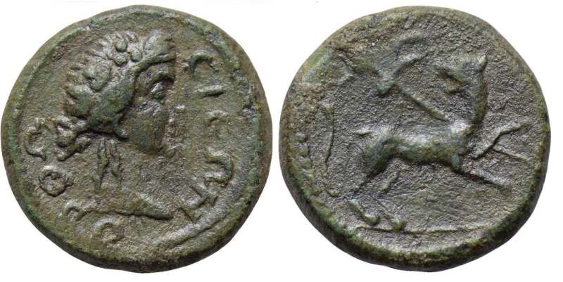 | BMC 5-6 | Orthosia, Caria, AE16, semi-autonomous issue. AD 69-96. 3.05 g. OΡΘΩΣIEΩN, head of Dionysos right, wreathed with ivy, hair in formal locks. / No legend, panther walking right, head left, transverse thyrsos behind shoulder. BMC 5-6; RPC II 1210; Paris 865; Winterthur 3520; Leypold I 840. | Text | Image |