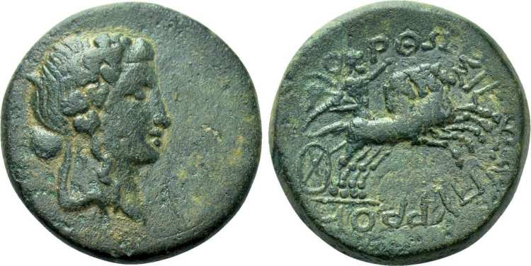 | SNG Tueb. 3461 | Orthosia, Caria, AE20 civic issue, 200-1 BC. 7.18 g. Magistrate: Pyrros. Head of Dionysos right, wreathed with ivy. / OΡΘΩΣIEΩN ΠYΡΡOY, Hades in galloping quadriga right, carrying off struggling Persephone. SNG Tuebingen 3461; Waddington 2517. | Text | Image |