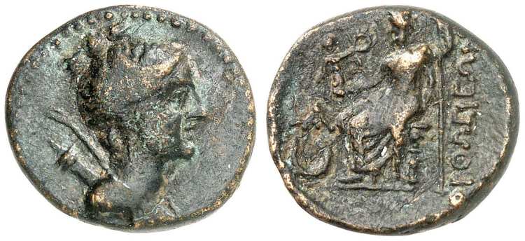 | SNG von Aulock 2644 | Orthosia, Caria, AE18 civic issue, 200-1 BC. 4.38 g. Head of Artemis right, bow and quiver over shoulder. / OΡΘΩΣIEΩN, Zeus seated left, holding Nike and sceptre. AT monogram over crescent in left field. SNG von Aulock 2644; Zeno 4041. | Text | Image |