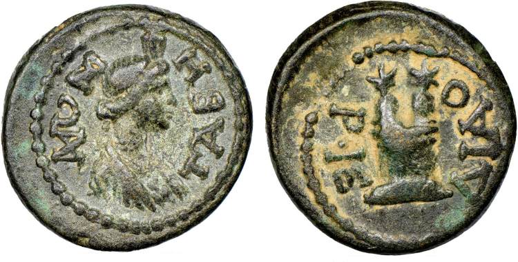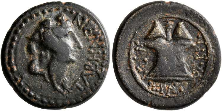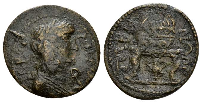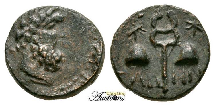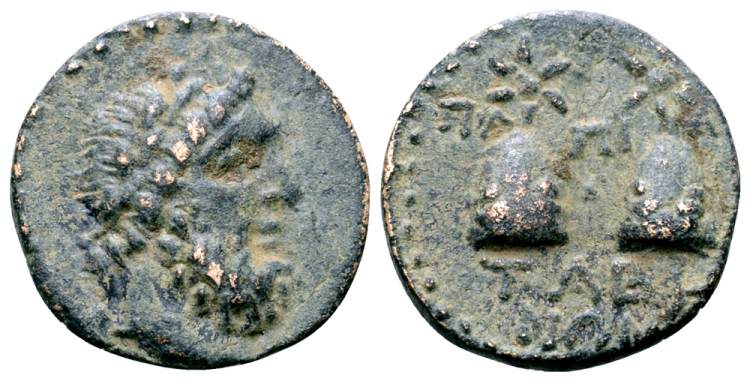 BMC 35 | Tabae, Caria. AE18. semi-autonomous issue. 3.92 g, Magistrate Kallikrates Brachyllidou. AD 69-79. TABHNΩN, Head of Dionysos right, wreathed with ivy. / KAΛΛIKΡATHΣ BΡA, Altar surmounted by the caps of the Dioskuri, small column or tip of a sceptre between them. BMC 35-37; RPC II 1251; Weber 6578; Mionnet Supp. VI 523; Luynes 2710; (cf RPC I S471F). | Text |  |
