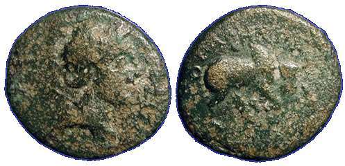 BMC 14 | Tabae, Caria, 1st C. BC. AE15, 3.73 gr. Head of young warrior right, wearing crested helmet, spear over shoulder / TABENΩN, humped bull butting right, ΘIM below. BMC 14; SNG Tuebingen 3492; SNG von Aulock 2699; Sear Greece 4947. | Text |  |