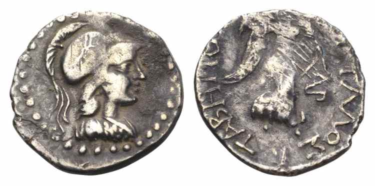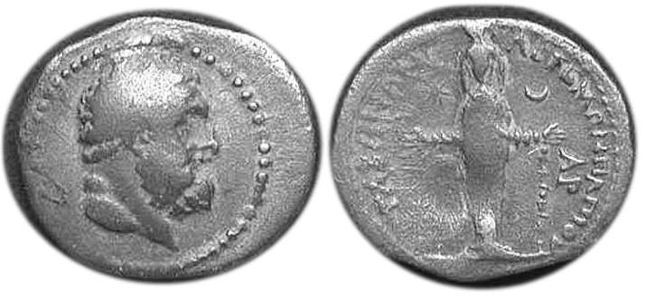 Troxell 27 | Tabae, Caria, 50-1 BC. AR drachm. 17.5 mm, 3.98 g. Head of Herakles right. / TABHNΩN ΠA AΡTEMΩN, Nemesis standing left, holding cornucopiae and with her hand to the neck of her robe. Troxell 27 in ANS MN 23, otherwise unpublished. | Text |  |