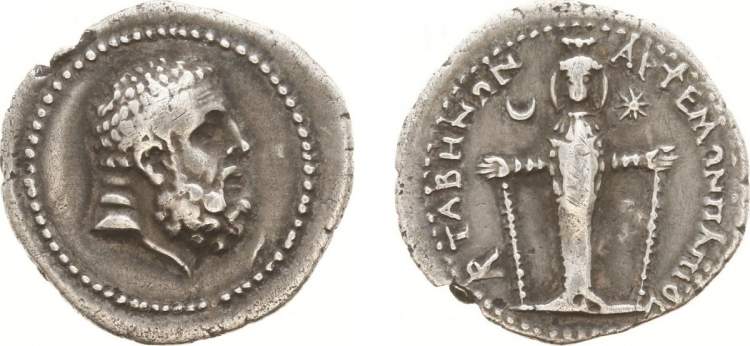 BMC 17 | Tabae, Caria, AR Drachm, 20 mm, 100-1 BC. Head of Herakles right. / TABHNΩN AΡTEMΩN ΠAΠIOY AΡ, cult image of Artemis Ephesia standing front, wearing polos and veil. Star and crescent across upper fields. BMC 17; Waddington 2598; Jameson 2306; Pozzi 2620; Walcher 2431; Rhousopoulos 3933; Weber 3182; McClean 8509; SNG Cop 529; SNG Fitz. 4734; SNG Tuebingen 3494. | Text |  |