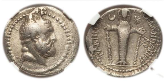 BMC 17 var (2) | Tabae, Caria, AR Drachm, 20 mm, 100-1 BC. 2.5 g. Head of Herakles right. / TABHNΩN AΡTEMΩN ΠAΠIOY, cult image of Artemis Ephesia standing front, wearing polos and veil. Crescent and star across upper fields. AΡ in centre right field. Var of BMC 17; Waddington 2598; Jameson 2306 etc. (all with star and crescent on opposite sides). Heritage 3038, 33113. | Text |  |