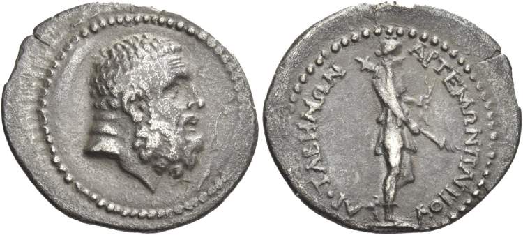 BMC 18 | Tabae, Caria, AR drachm. 50-1 BC. 2.77 g. Bearded head of Herakles right. / TABHNΩN AΡTEMΩN ΠAΠIOY AΡ, Artemis standing right, holding torch and bow, quiver over her left shoulder. BMC 18; SNG Cop 530; Weber 6574; SNG von Aulock 2702. | Text |  |