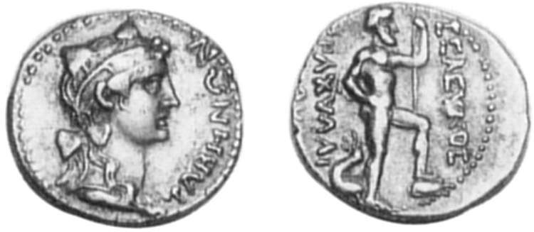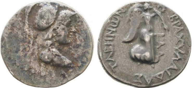 BMC 29-30 | Tabae, Caria, AR drachm, 50-1 BC. 3.51 g. TABHNΩN, head of Dionysos right, wreathed with ivy. / ΣEΛEYKOΣ BΡAXYΛΛIΔOY, Poseidon standing right, holding trident, left foot on prow, dolphin swimming downwards foot left. BMC 29-30; Waddington 2605. | Text |  |