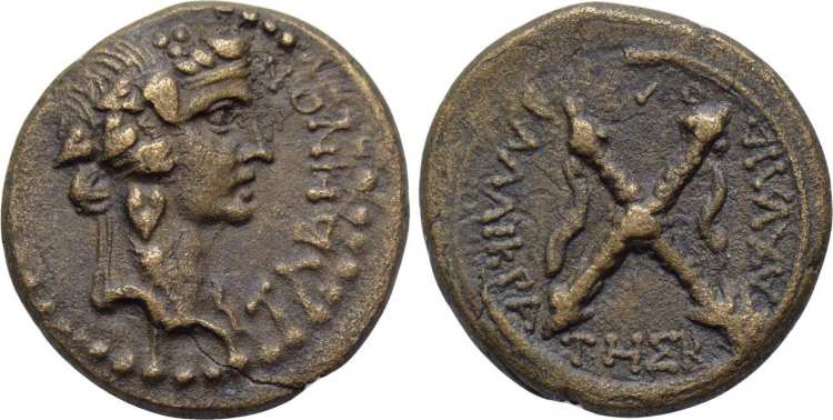BMC 31-34 | Tabae, Caria. AE21. semi-autonomous issue. 5.75 g. AD 54-96. Magistrate Kallikrates Brachylidos. TABHNΩN, Head of Dionysos right, wreathed with ivy. / KAΛΛIKΡATHΣ BΡAXYΛIΔOY, Two crossed, filleted thyrsoi. BMC 31-34; SNG von Aulock 2705; SNG Tübingen 3495; Waddington 2625; Rhousopoulos 3937; Weber 6577; SNG Cop 536-537; RPC II 1250. | Text |  |